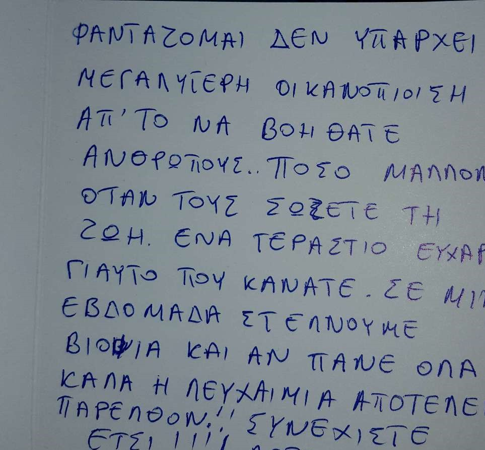 «Ο κόσμος μας γύρισε ανάποδα σε ένα απόγευμα, πως μπορεί να συμβεί αυτό; Φαινόταν υγιής και δεν μπορούσαμε να φανταστούμε τη διάγνωση της λευχαιμίας !!». λέει ο σύζυγός της, Μ.