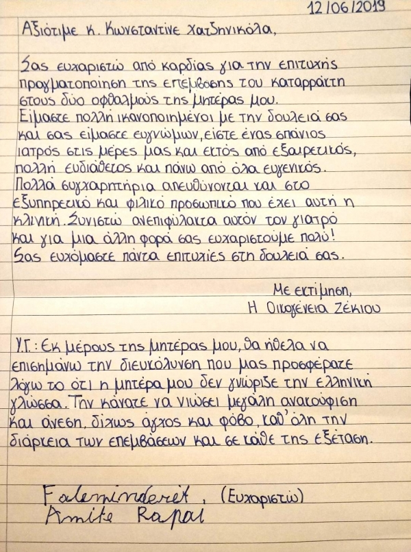 Ευχαριστώ πολύ την κα Αμιτε για την εμπιστοσύνη που μου έδειξε, η οποία και ήρθε από την Αλβανία όπου μένει μόνιμα, για να χειρουργηθεί στην Μονάδα Ημερήσιας Νοσηλείας μας- Ophthalmic Day Clinic.